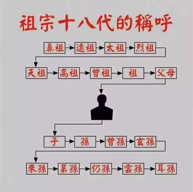 所谓祖宗十八代是指自己上下九代的宗族成员,从小到大分别为:耳、云、仍、晜、来、玄、曾、孙、子、父、祖、曾、高、天、烈、太、远、鼻。用来来形容事或人的源远流长。